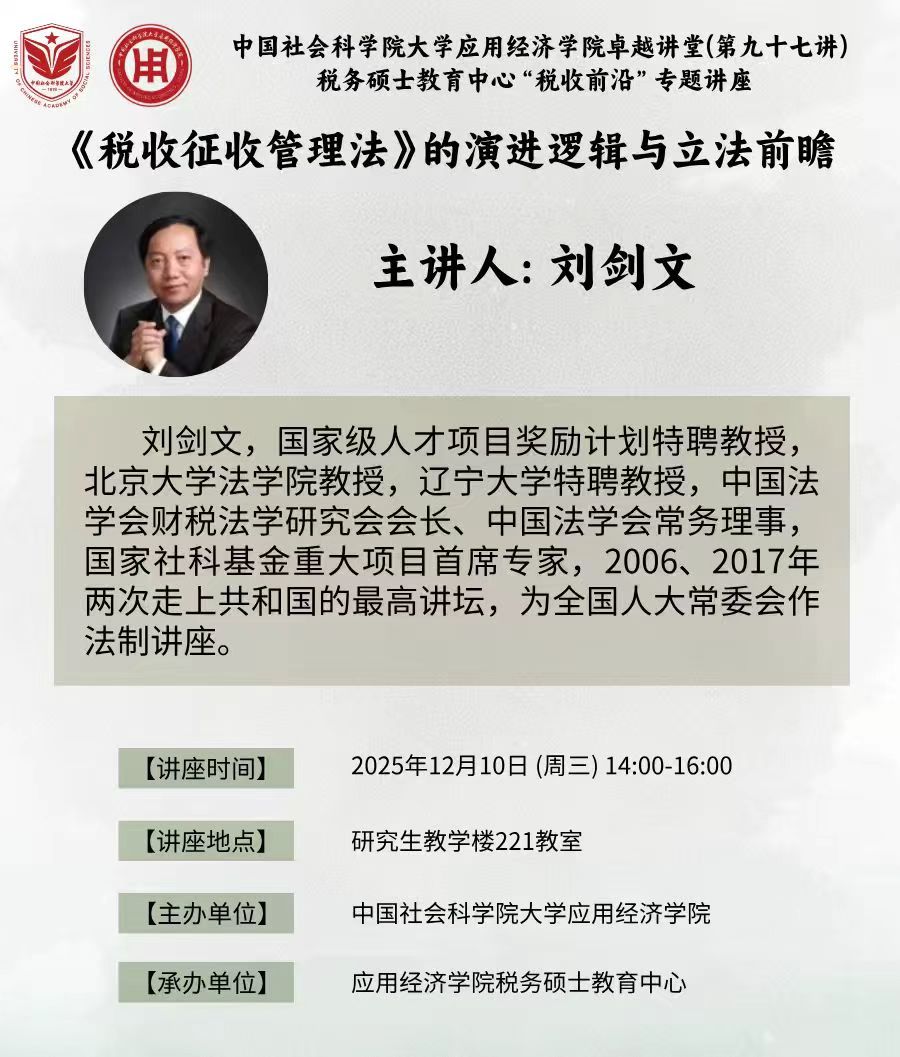 2025-12-122025年12月10日,中国社会科学院大学应用经济学院卓越讲堂(第九十七讲)暨税务硕士教育中心“税收前沿”专题讲座于良乡校区研究生教学楼221教室成功举办。本次讲座特邀我国财税法学领域的领军学者刘剑文教授担任主讲人,主题为“《税收征收管理法》的演进逻辑与立法前瞻”。刘剑文教授是国家级人才项目奖励计划特聘教授,现任北京大学法学院教授、辽宁大学特聘教授,兼任中国法学会常务理事、中国法学会财税法学研究会会长,并...