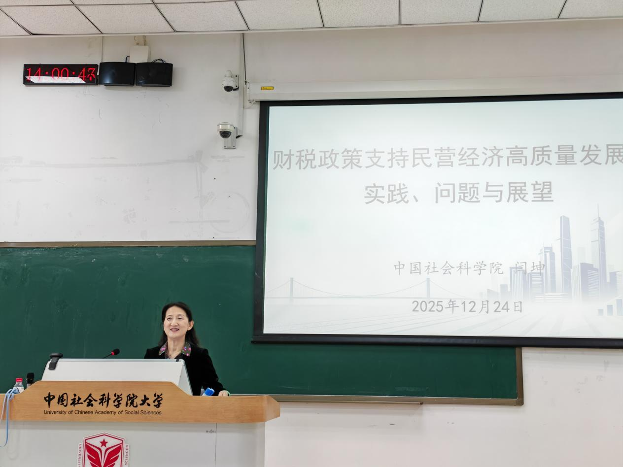 2025年12月24日,中国社会科学院大学应用经济学院卓越讲堂(第一百零六讲)暨税务硕士教育中心“税收前沿”专题讲座在良乡校区研究生教学楼221教室成功举办。本次讲座特邀宏观经济、财政理论与货币政策领域专家闫坤教授担任主讲人,主题为“财税政策支持民营经济高质量发展:实践、问题与展望”。闫坤教授是中国社会科学院财经院、农发所、日本所原党委书记,全国日本经济学会会长,中国社会科学院城乡发展一体化智库副理事长,中国社会科学院财税研究中心副主任,中国财政学会和中国审计学会常务理事。本次讲座由中国社会科学院大学应用经济学院执行院长倪红福教授主持。